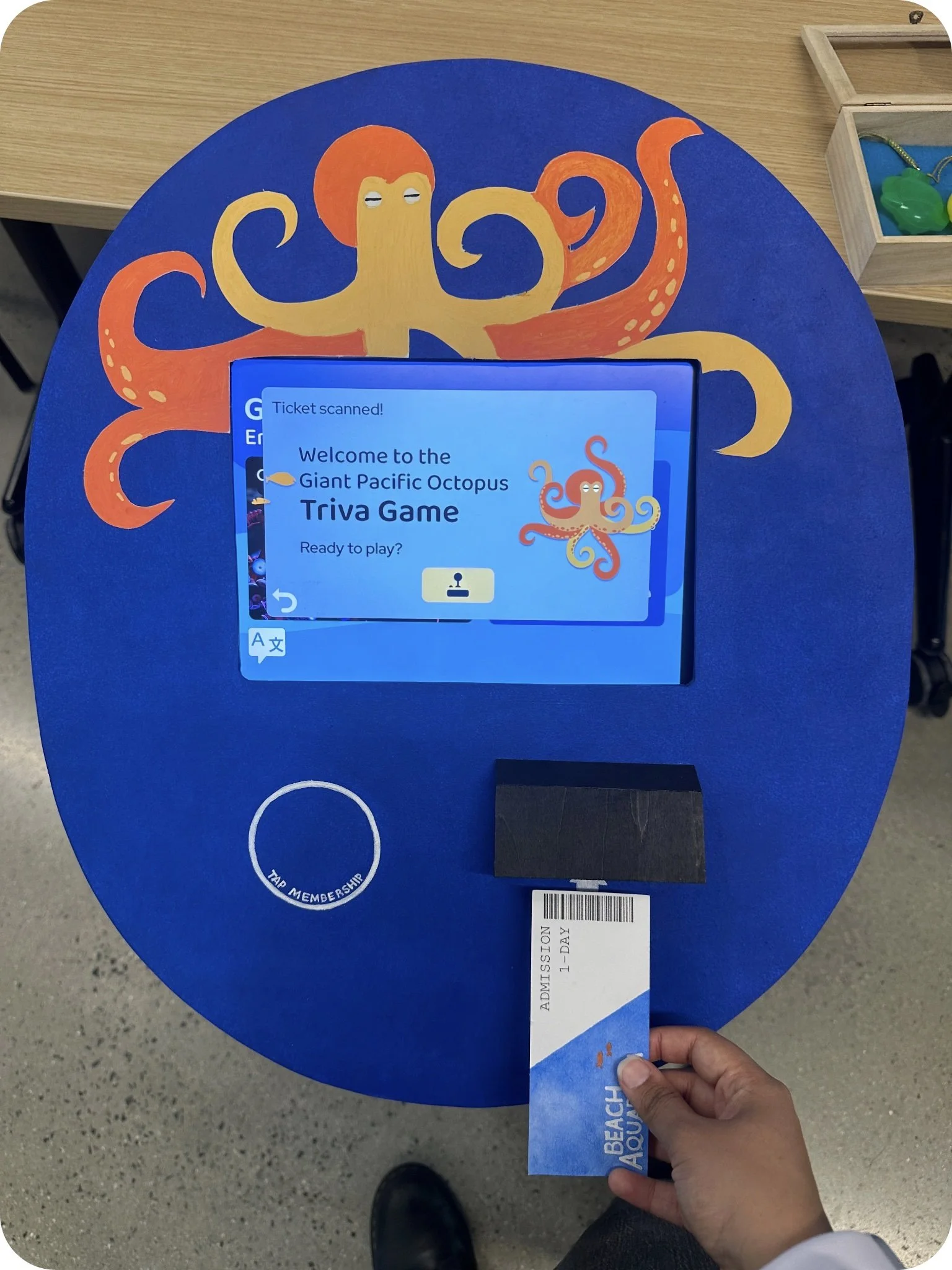 Users with day pass tickets and users with membership charms have different interactions available to them. We included tickets and charms as extensions to the kiosk. They bring a more complete user experience, and allow us to fully take advantage of the aquarium kiosk form factor. This creative solution to our goal of incentivizing users to buy membership intrigued many visitors at the exchange.