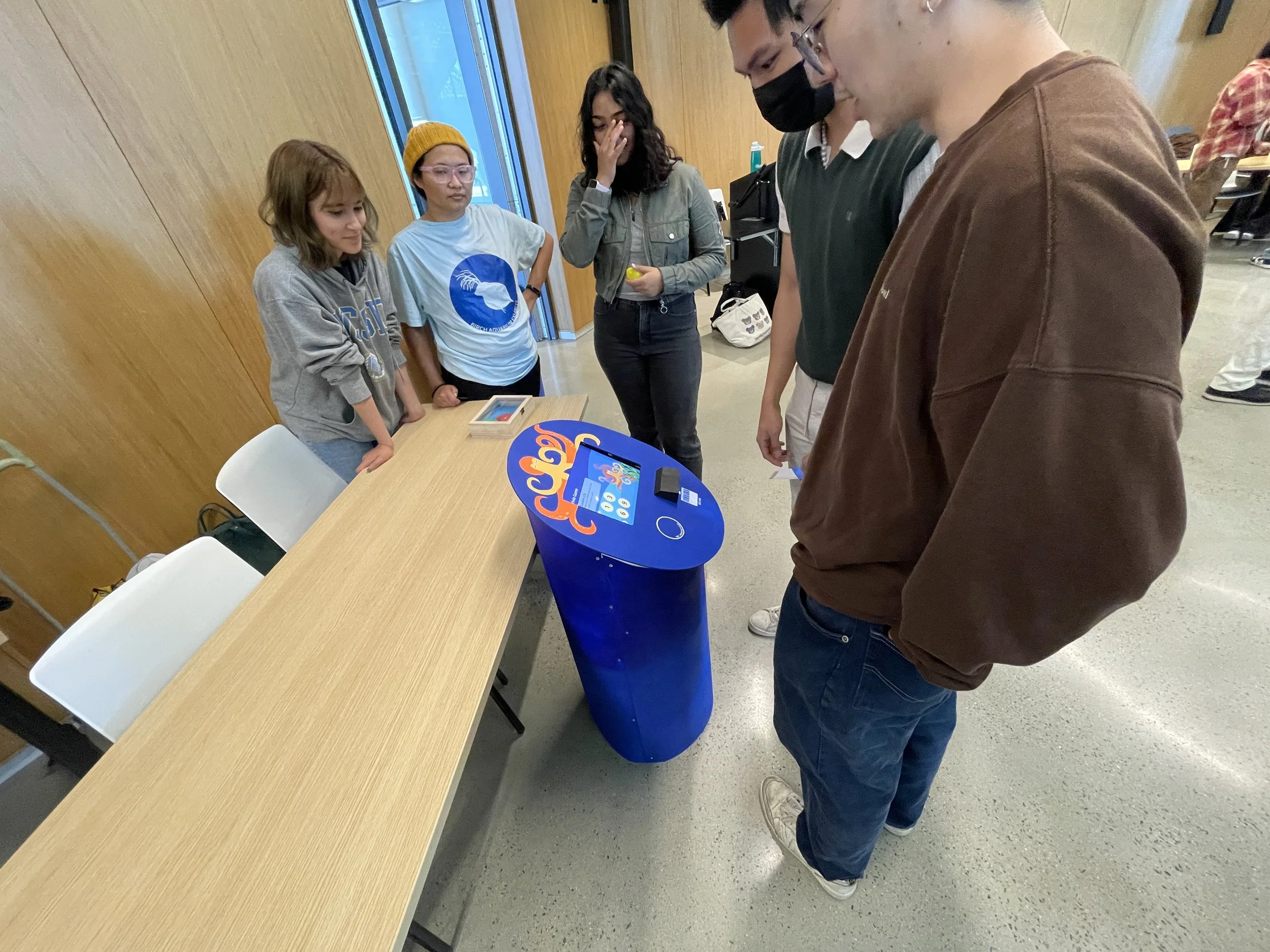 The Birch Aquarium Kiosk is a complete product with both hardware and software. My team and I started with need-finding, brainstorming and ideation, and field research to narrow our project to be a kiosk for museums and aquariums. We then created a few personas to represent our intended users, and drew storyboards to select interactions. We used existing Birch Aquarium style guide and our own moodboard to determine how the kiosk should feel. I used my own expertise in graphic design to complete a style guide for our product. From there, half of our team worked on fabrication of the physical kiosk while another teammate and myself worked on the UI of the kiosk. I confirmed our user flow with a user flow diagram. From there, we built up the UI from wireframe, to high fidelity prototype. In the end, our hardware and software teams came together to present our final product.